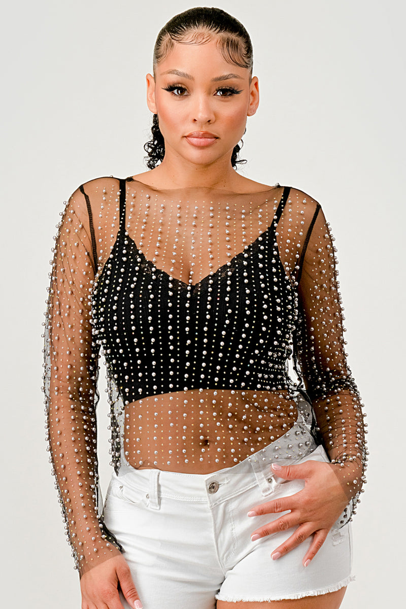 092425 Pearl Rhinestones Sheer Mesh Long Sleeve Top- Black