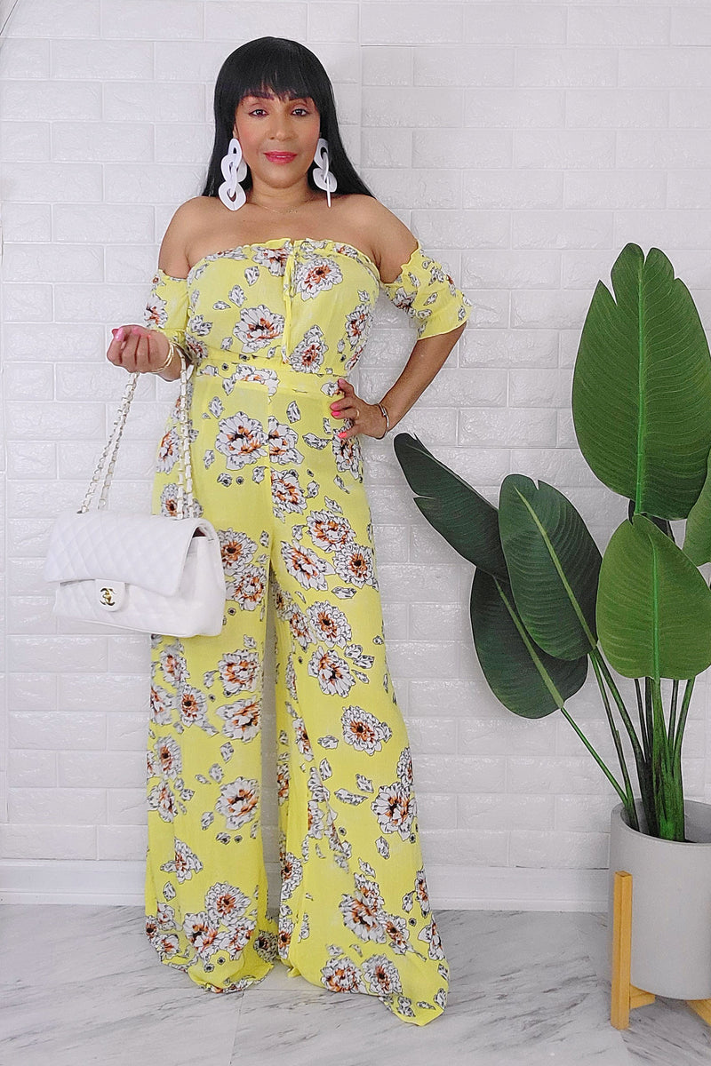 042324 Yellow Spring Flowers Print Lastite High Waist Pants Set