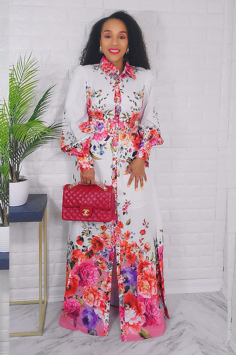 Go to the shopGarden border print maxi dress features a button-down front, bishop sleeves, and an A-line silhouette that gathers at the waist with a removable belt accessory.